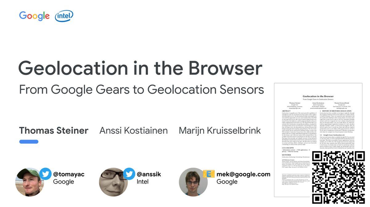 📢 Slides for our @locweb paper Geolocation in the Browser—From Google Gears to Geolocation Sensor: 👉 docs.google.com/presentation/d/18JhPwUXbzevUcTzwkermeIBtLGwIZWS9MJ2qLjexMAU/edit?usp=sharing 📍 Preso: @TheWebConf #LocWeb #TheWebConf, 16:40PST, room Marina. 📄 Paper: github.com/tomayac/geolocation-in-the-browser/raw/master/geolocation.pdf [PDF]. 🤝 Joint work: @anssik, M. Kruisselbrink.