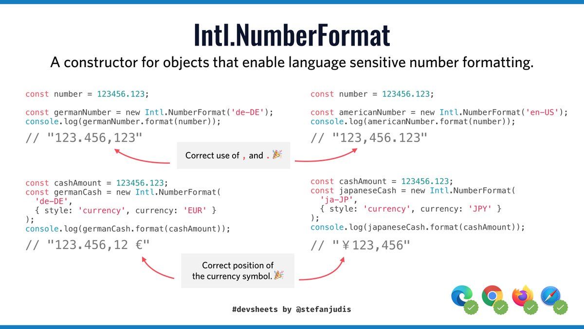 Intl.NumberFormat. 🔗 MDN: developer.mozilla.org/en-US/docs/Web/JavaScript/Reference/Global_Objects/NumberFormat #devsheets