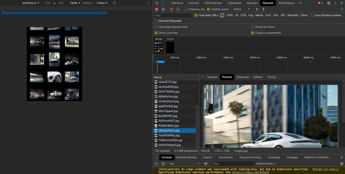 @nhoizey @bdc In a production app, you'd probably only load the full-resolution images in the lightbox view. Lazy-loading is quite aggressive, test it with a (simulated) JioPhone 2 (kicks in at the selected image). The bigger problem are the missing dimensions (see console in the screenshot).