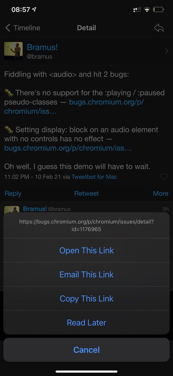 @echofon Bug report: tweets with two or more links pointing to the same origin (but not the same path) appear to link to the same URL, when clearly they are not. See the screenshots of the first and second link. Example tweet: x.com/bramus/status/1359623743874727945