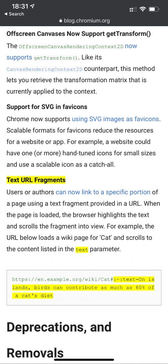 🙋 Chrome for iOS users: the latest version shipped with a polyfill (github.com/GoogleChromeLabs/text-fragments-polyfill) of the text fragment URL (htts://web.dev/text-fragments/) feature: Try opening blog.chromium.org/2019/12/chrome-80-content-indexing-es-modules.html?m=1#:~:text=Text%20URL%20Fragments&text=text,-parameter&text=:~:text=On%20islands,%20birds%20can%20contribute%20as%20much%20as%2060%25%20of%20a%20cat's%20diet in Chrome for iOS and compare to Safari. How it started: x.com/tomayac/status/1288457294641061890.