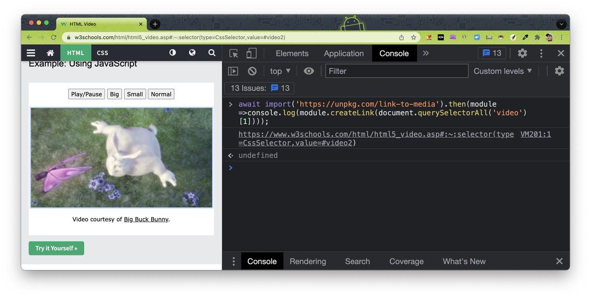 ① Go to w3schools.com/html/html5_video.asp (bare with me, it's just a page with two videos). ② Paste the code below into the @ChromeDevTools Console.