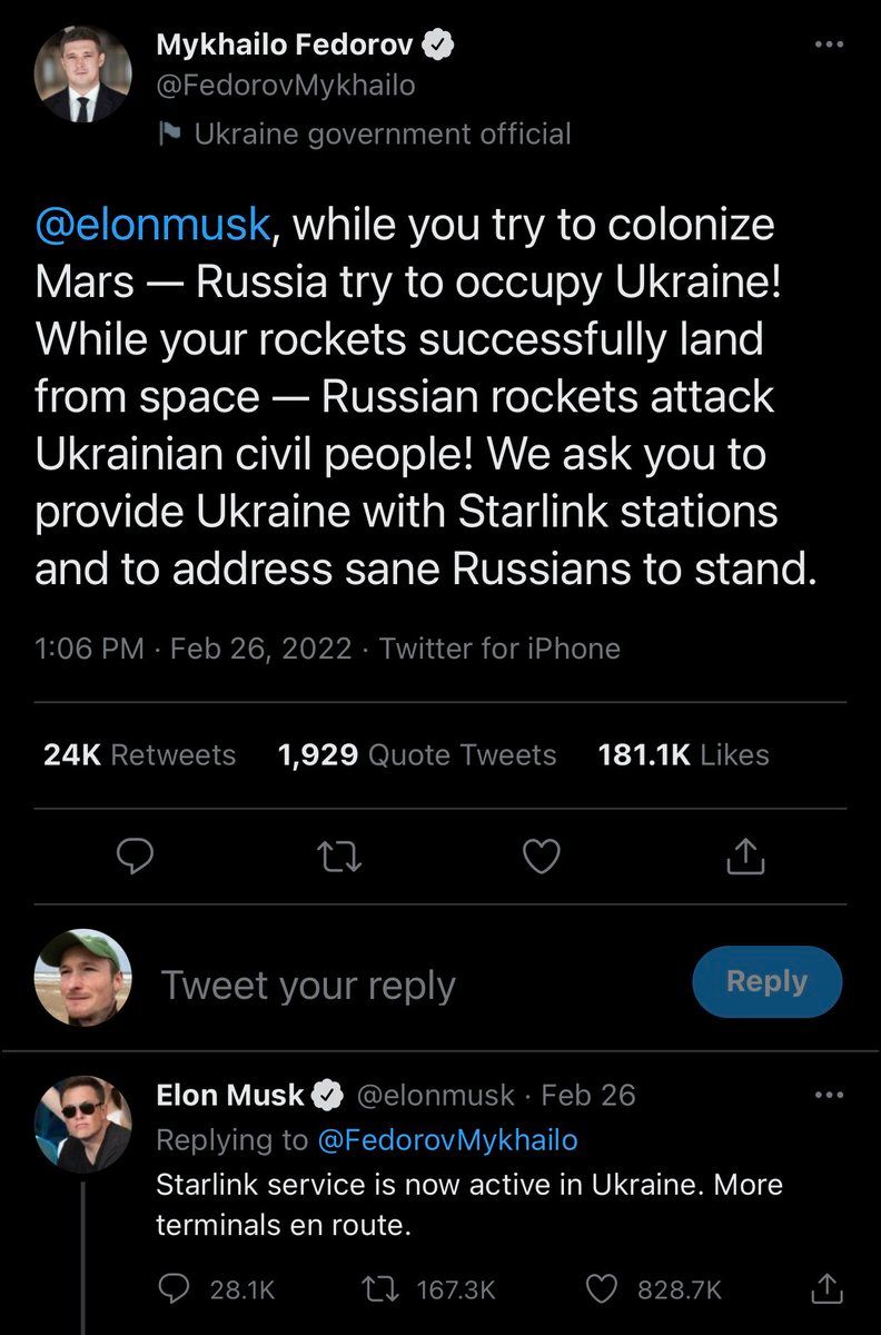❓Question: x.com/FedorovMykhailo/status/1497543633293266944 ❗️Answer: x.com/elonmusk/status/1497701484003213317 These satellites 🛰 and dishes 📡 are being used for good it seems: arstechnica.com/tech-policy/2022/03/starlink-helps-ukraines-elite-drone-unit-target-and-destroy-russian-tanks/. Not an Elon fan in general, but good to know that @elonmusk & Company #StandWithUkraine 🇺🇦.