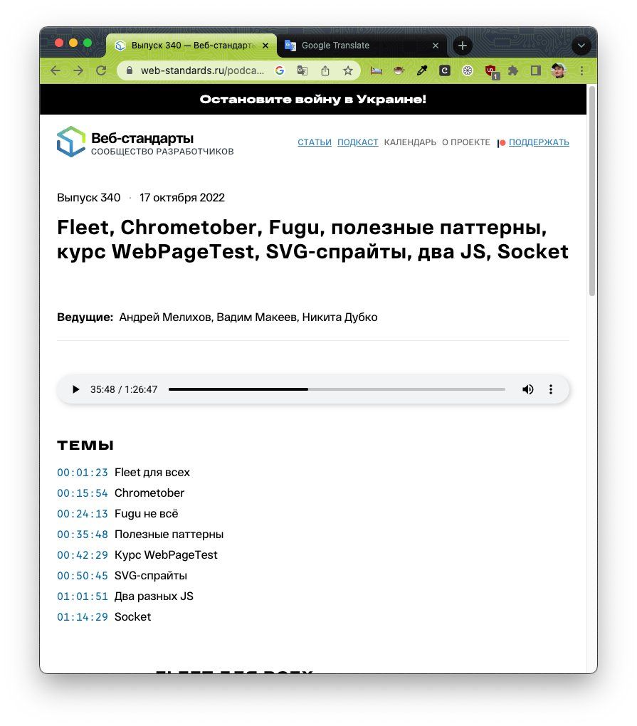 The @webstandards_ru folks have discussed if Project Fugu 🐡 is done (developer.chrome.com/blog/is-project-fugu-done/, deep link web-standards.ru/podcast/340/#00:24:13) and the new patterns for amazing apps (web.dev/new-patterns-for-amazing-apps/, deep link web-standards.ru/podcast/340/#00:35:48). Остановите войну в Украине! #StandWithUkraine 🇺🇦