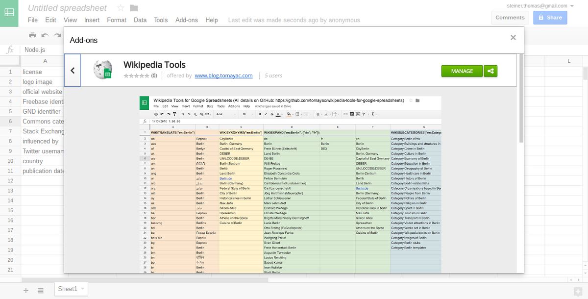 The Wikipedia Tools for Google Spreadsheets are now available as an official Sheets Add-On: