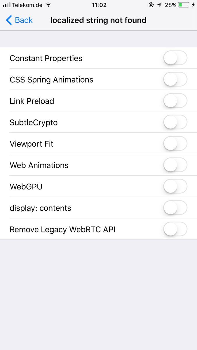 😮 iOS 11 Beta 2, Settings > Safari > Advanced > Experimental Features > localized string not found. This looks like Safari’s about://flags