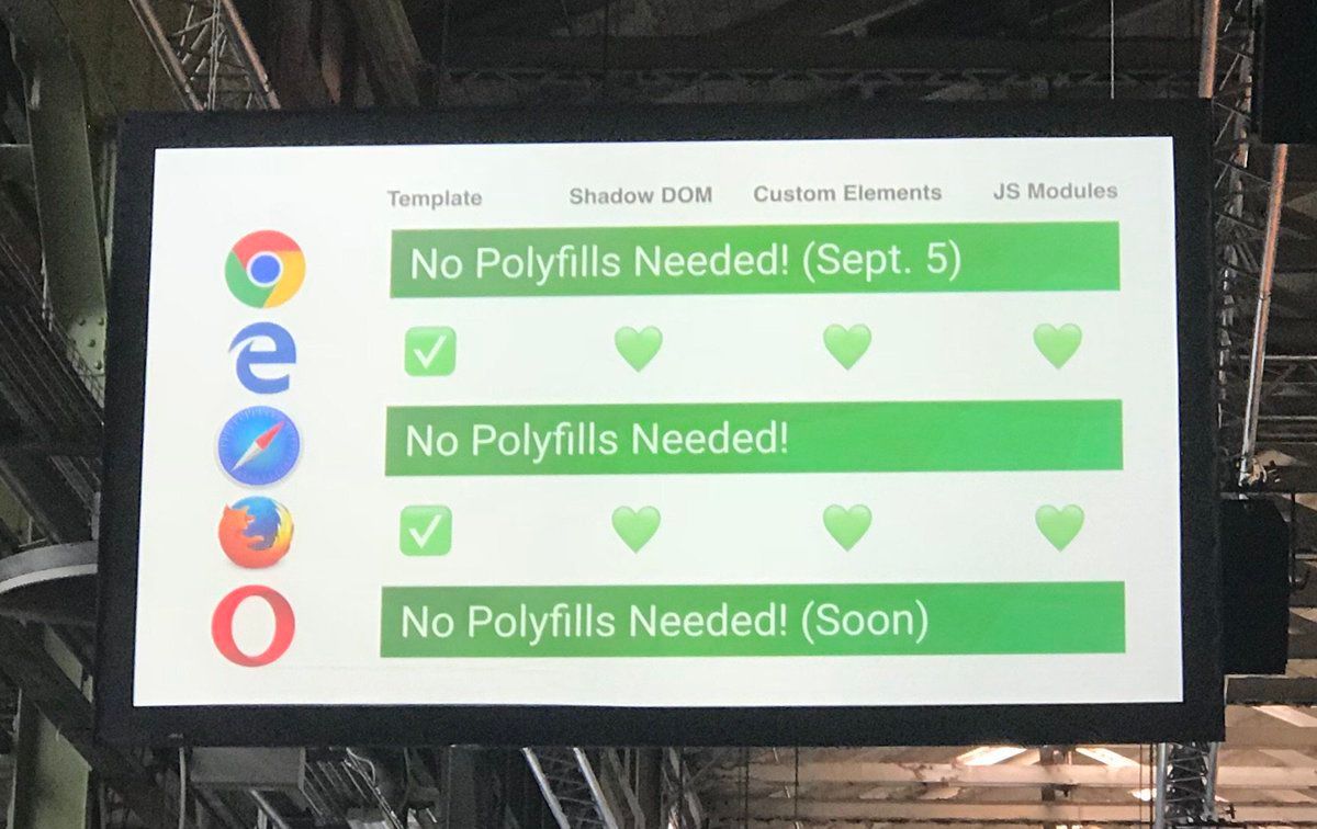 🎉 Moving to ES6 modules makes the “no polyfills needed” chart look incredibly greener. #PolymerSummit Finally _can_ #UseThePlatform. 💚✅