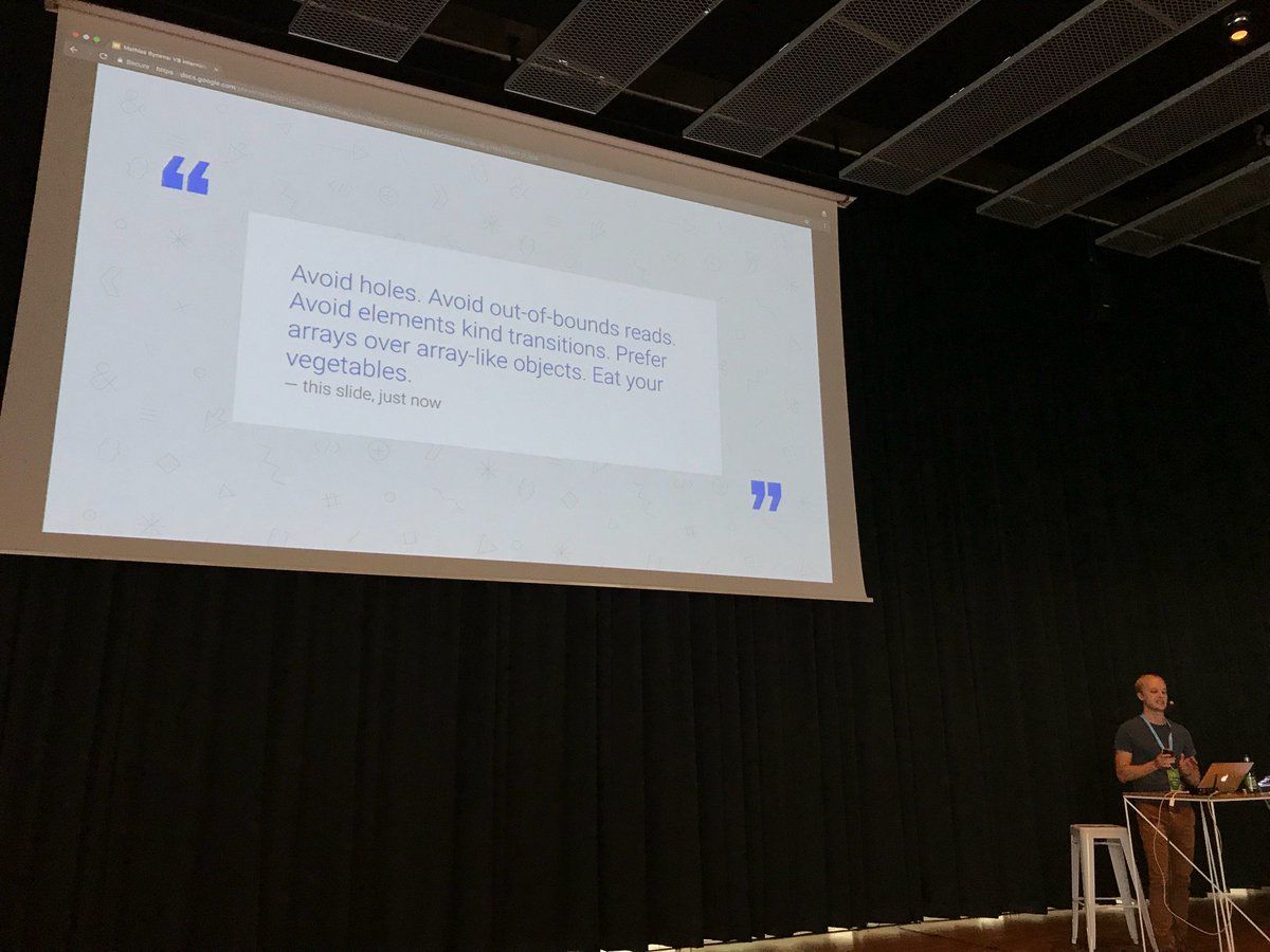 “Avoid holes. Avoid out-of-bounds reads. Avoid elements kind transitions. Prefer arrays over array-like objects. Eat🥕.”—